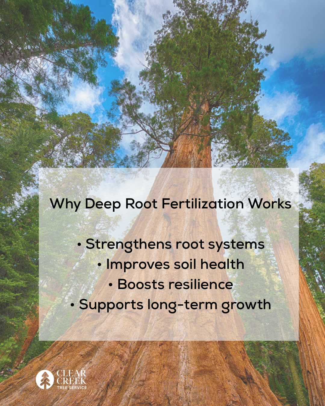 Clear Creek Tree Service uses science-based treatments to support long-term tree health rather than short-term cosmetic results.